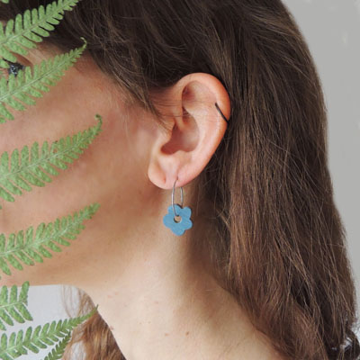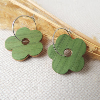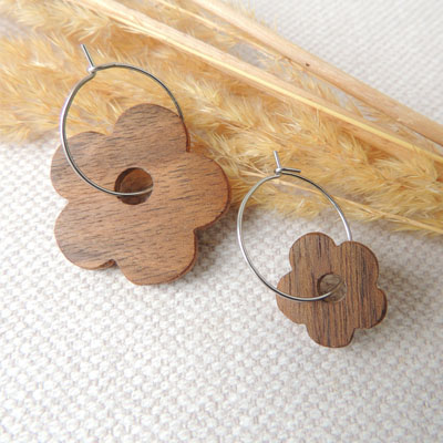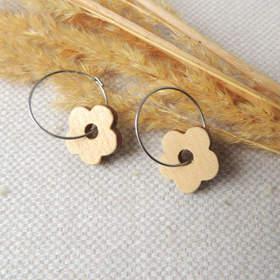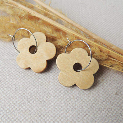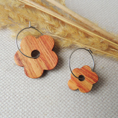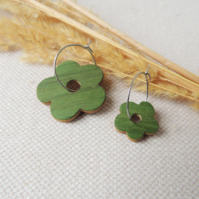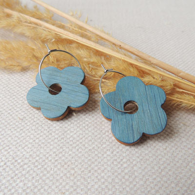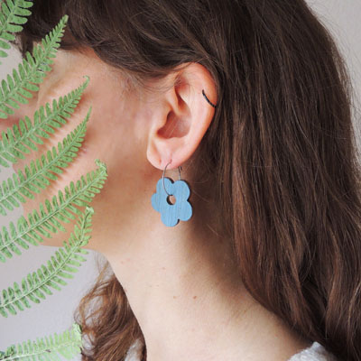 Je lie des techniques traditionnelles d’ébénisterie et d’autres, plus inventives, apprises en autodidacte. Je superpose des feuilles de bois de différentes essences, je les découpe ensuite à la scie à chantourner, puis vient le ponçage, l’assemblage et la finition. Les bijoux sont fabriqués un à un à la main dans mon atelier en Isère (FR), ils seront donc légèrement différents de la photo.